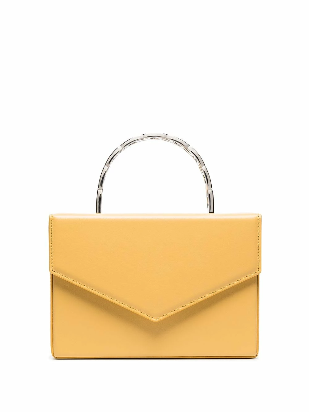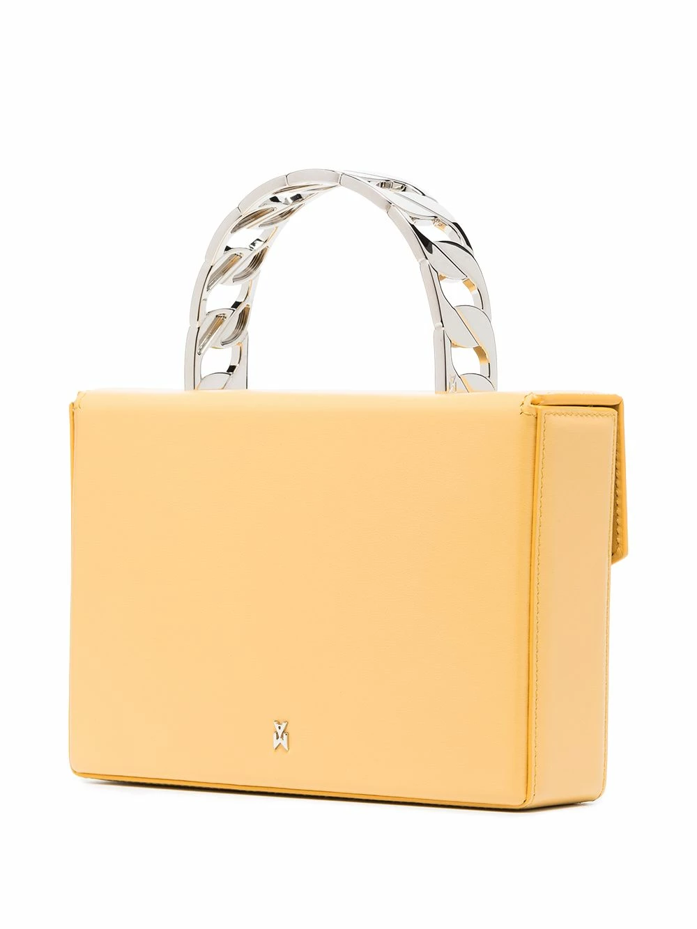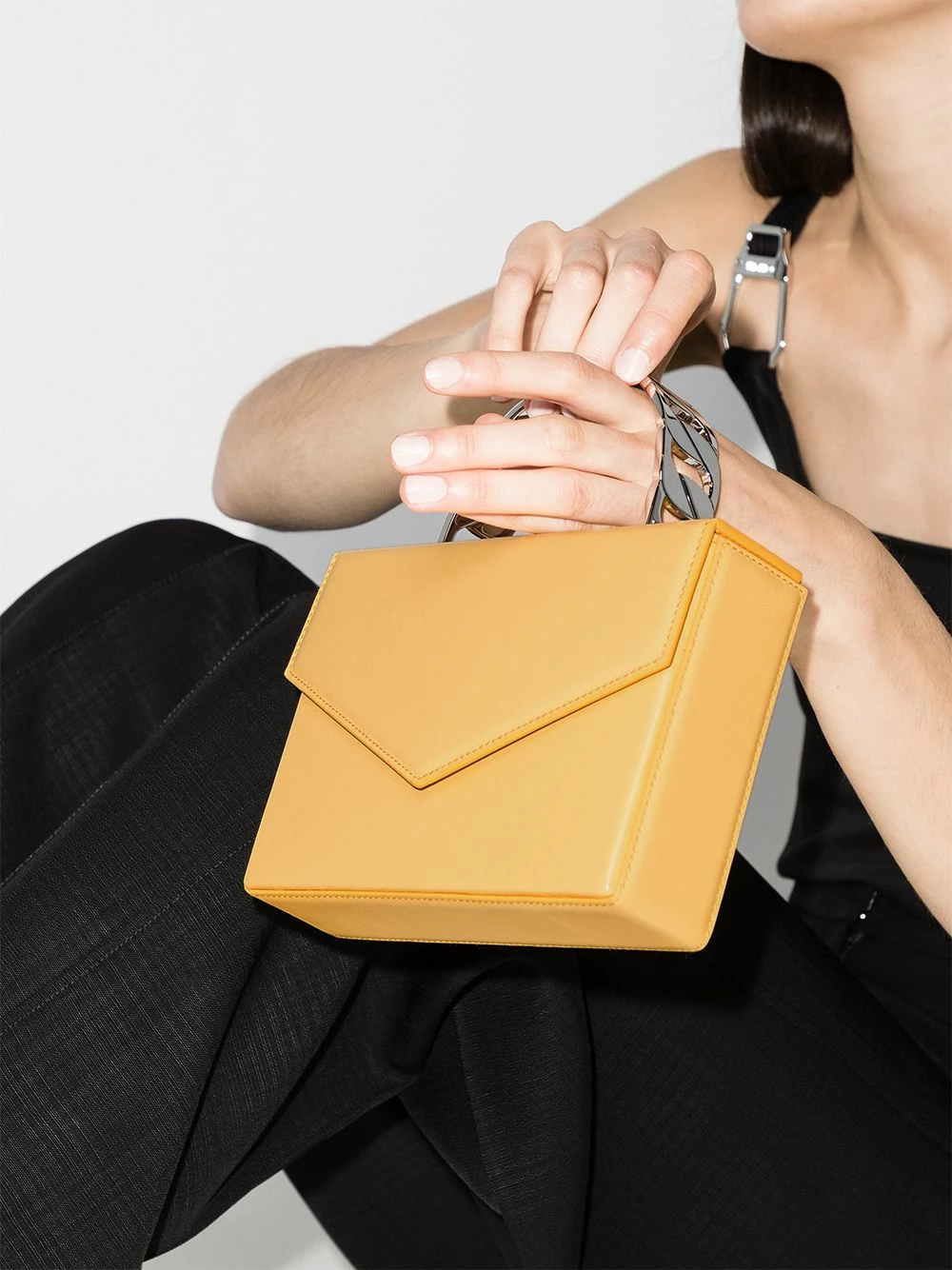 Amina Muaddi’s AW21 collection reflects the brand’s flamboyant and joyful approach to accessories, with bold prints and eye-catching details. The Amini Pernille bag is crafted from leather in a bright yellow shade and completed with a refined chain-link top handle. With a structured rectangle shape, it fastens at the front with a magnetic closure.