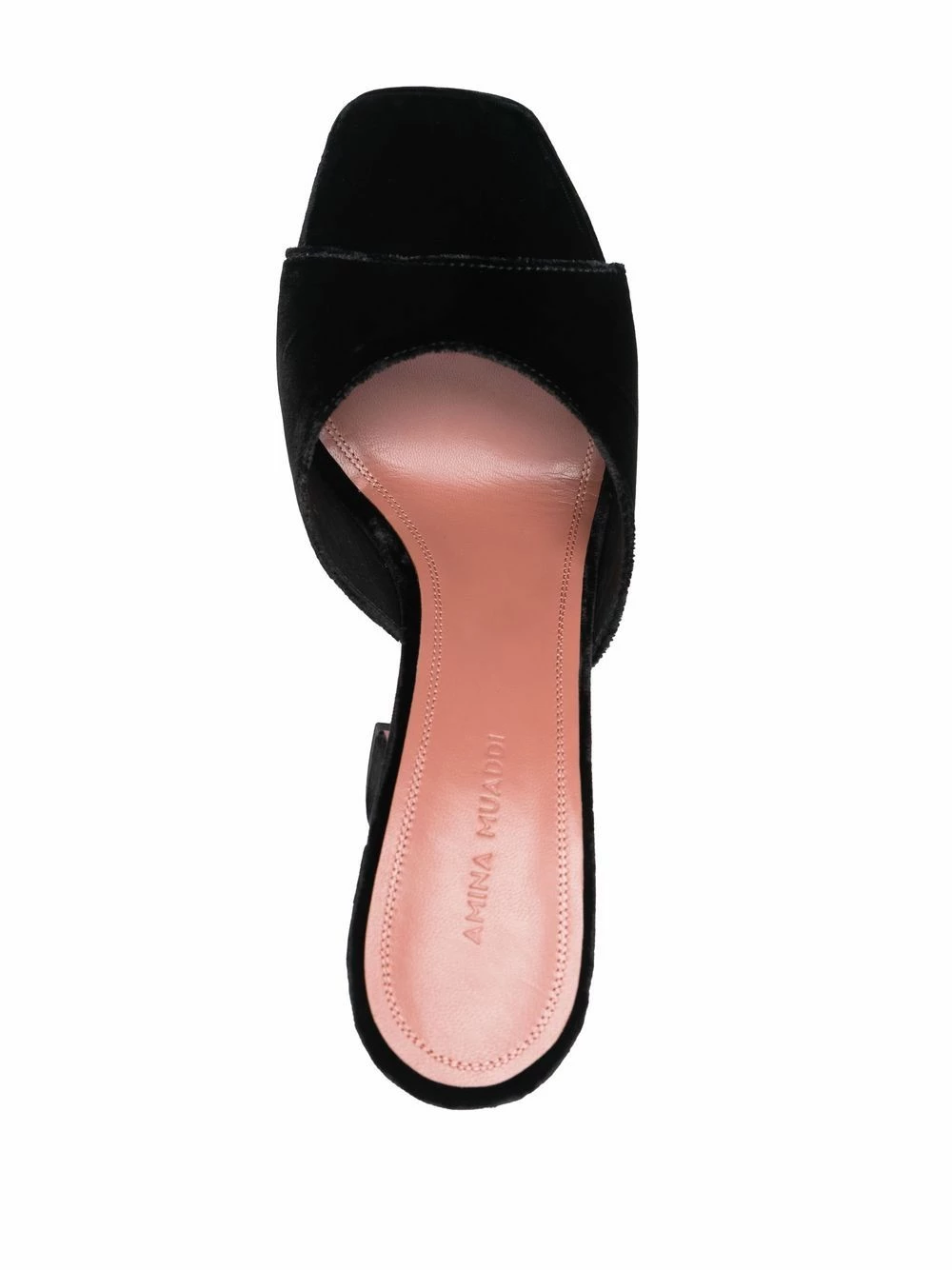 Amina Muaddi’s sculptural style is showcased with the black Dalida sandals. Crafted in a leather and velvet fabrication, the slip-on design boasts a 45mm platform and towering 140mm heel for a dramatic silhouette.